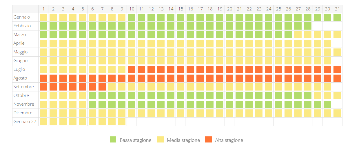 La durata minima del noleggio può variare a seconda del periodo di riferimento, è pari a 3 notti (bassa stagione); 7 notti ferie a Natale (stagione intermedia); 13 notti ferie estive (alta stagione).
